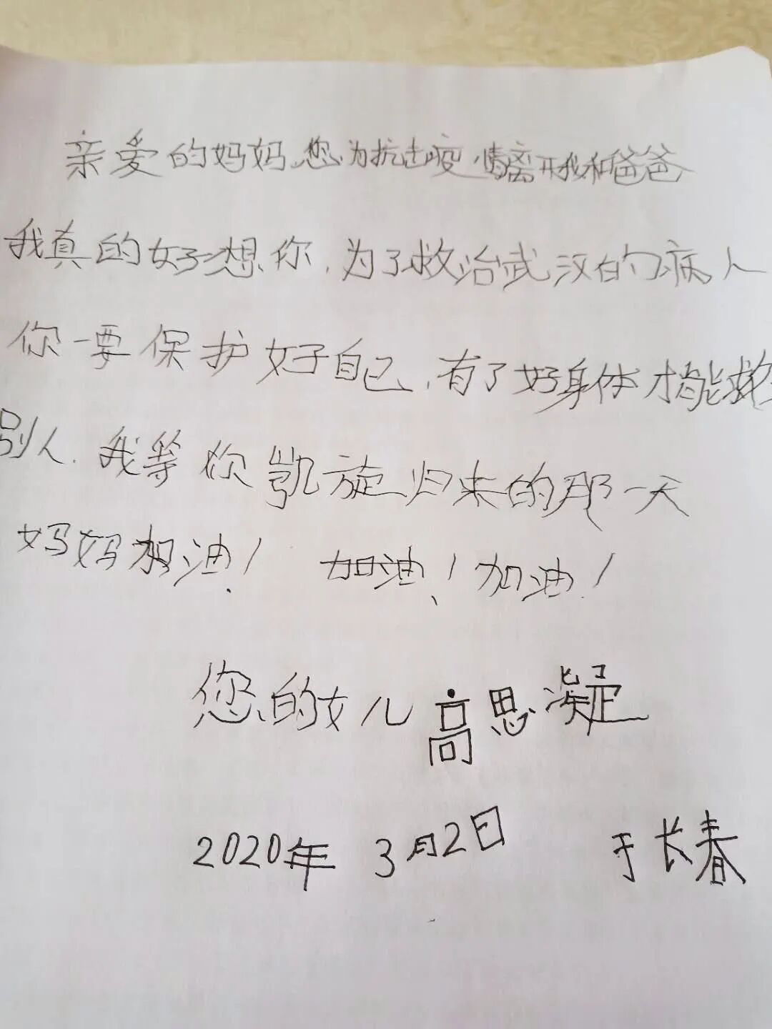 下了班,疲倦的我回到宿舍休息,突然一个熟悉的铃声响起,原来是婆婆给我来信息了,打开一看,女儿稚嫩的字体映入眼帘,原来是6岁的女儿给我写了一封信:“亲爱的妈妈,您为抗击疫情离开了我和爸爸,我真的好想你,为了救治武汉的病人,你一定要保护好自己,有了好身体才能救别人,我等你凯旋归来的那一天!妈妈,加油!加油!加油!”看到6岁的女儿为我加油助威,感觉她长大了,也懂事了。一瞬间,我的眼泪再也控制不住。