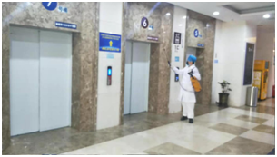 进入住院部需要乘坐患者专用电梯,一楼、二楼电梯口专门设有保安岗,对探视陪护人员进行严格管理,无陪护卡者严禁进入;乘坐电梯时,为避免直接用手接触按键,电梯处设有“按键专用纸巾”;同时,电梯间会定时消毒。